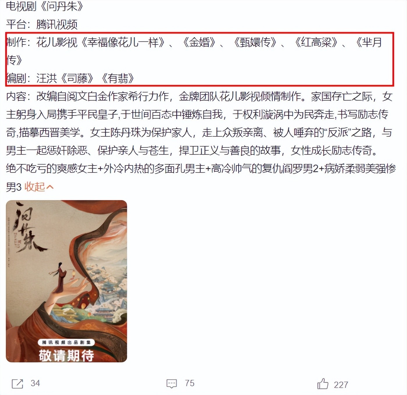 知情人士透露,《问丹朱》的编剧是汪洪,提到汪洪,我们会想到《司藤》和《有翡》,这两部剧都取得非常亮眼的成绩,看到这样的制作阵容后,网友们表示:说不定《问丹朱》真的有可能成为下一部《长相思》。